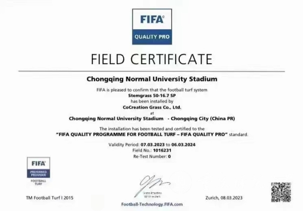 FIFA认证是全球足球领域最权威的足球场地检测认证,代表着行业的最高标准。国际足联FIFA QUALITY PRO认证证书的获得,意味着我校拥有职业足球训练及比赛的专业场地,并具有承办国际足球赛事的资质,这将全面提升学校校园环境和办学水平,有助于我校高水平运动员培养,助推学校高质量发展。